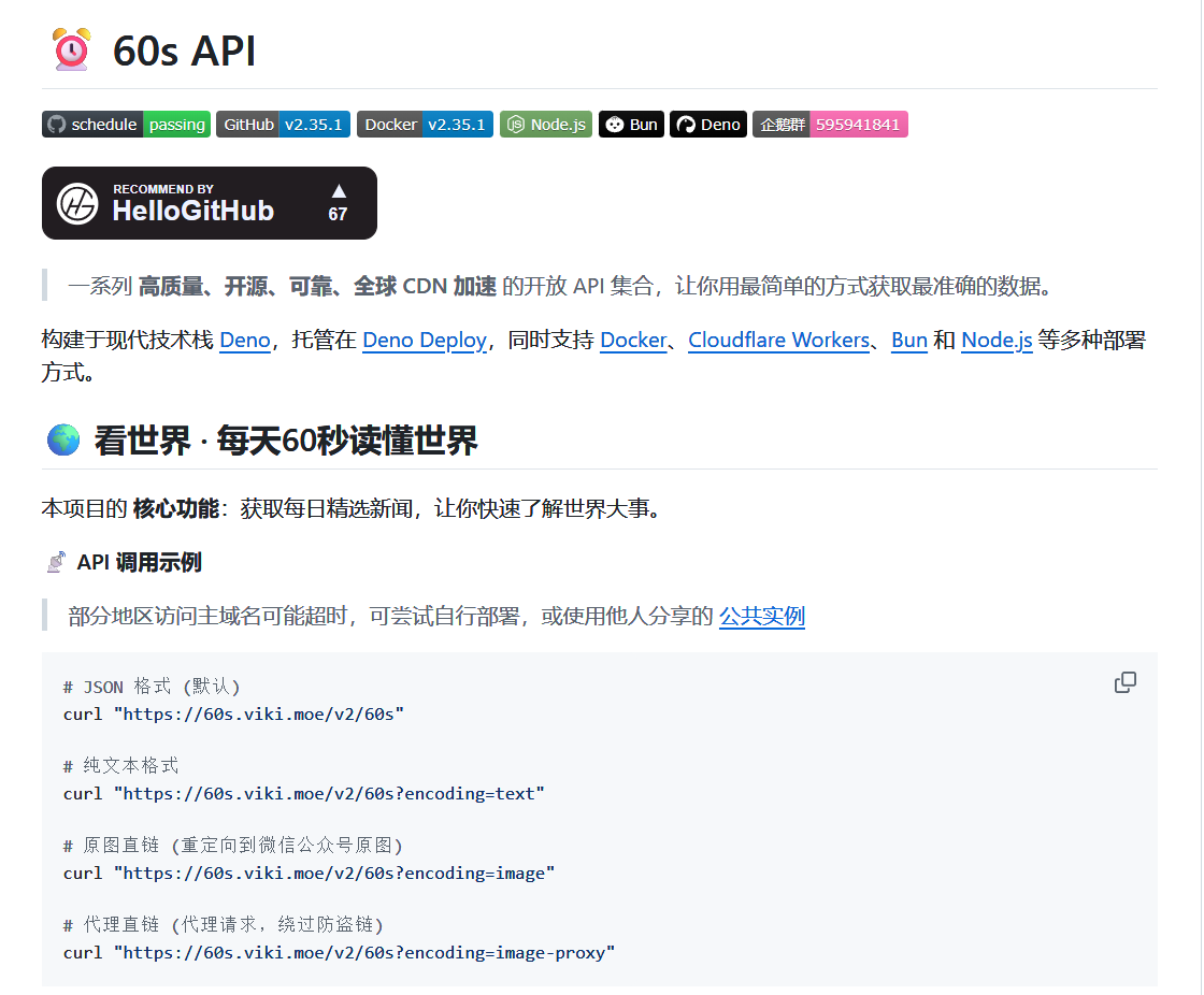 基于@vikiboss 大佬的60s项目 搭建了一个热榜api 具体使用方法可以参考官方的使用文档,这里不赘述了。 可以应用于自己的网站,也可以制作独立网页应用 还可以制作成这样的热榜信息显示网站 a...